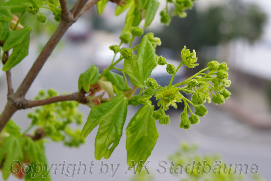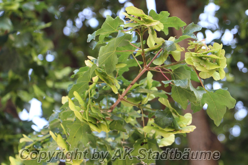 | Blätter | sommergrün, gegenständig, 5 bis 8 cm lang und 5 bis 10 cm breit, 3-5-lappig, stumpfeckig, Milchsaft führend; Laubfall später als die Art |